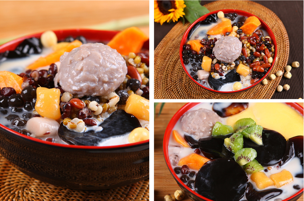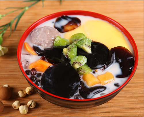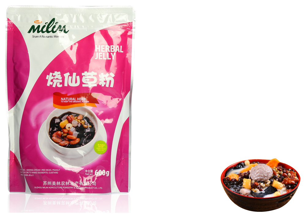 我司烧仙草有杯装和袋装两种。前者配有料包直接用开水冲调即能饮用,后者主要用于甜品。